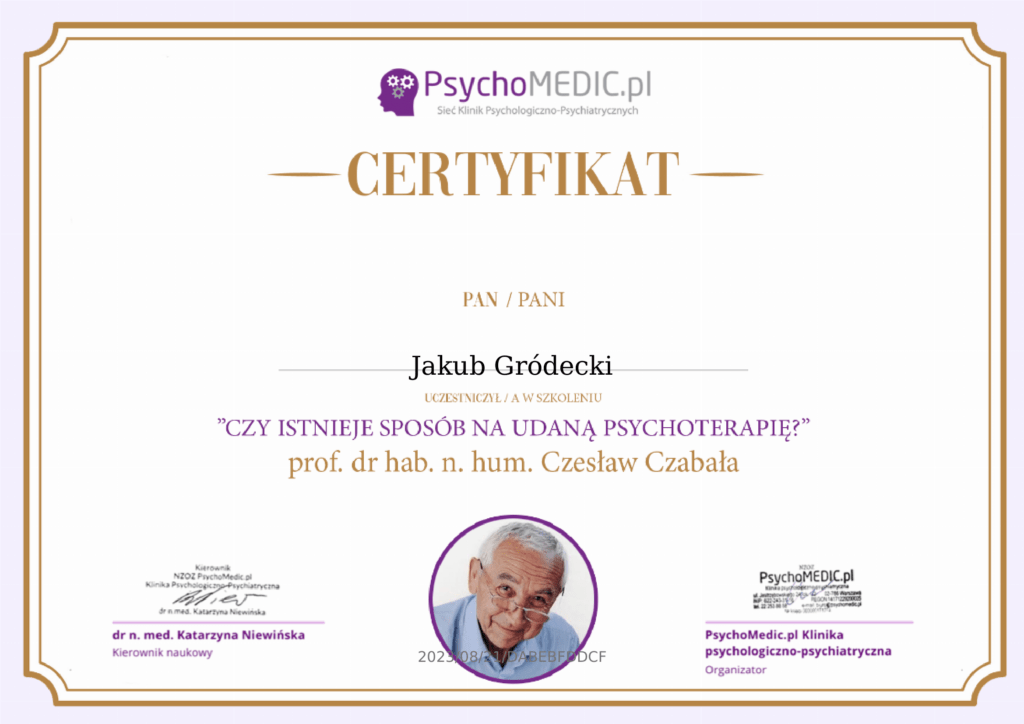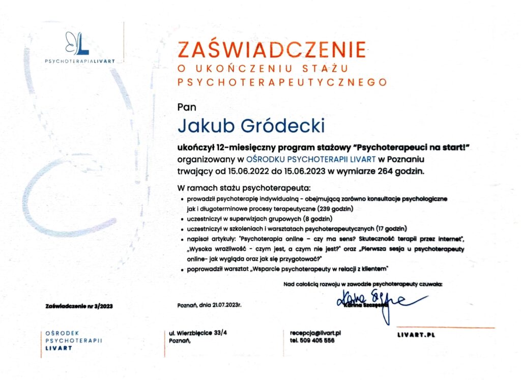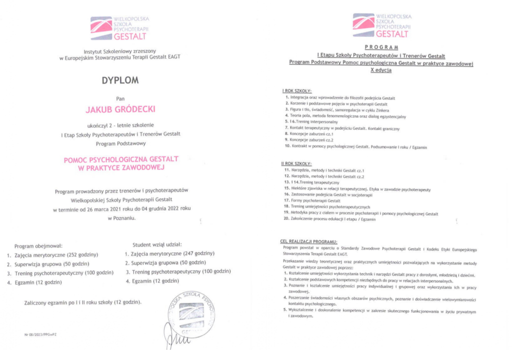 - Ukończony program „Pomoc Psychologiczna Gestalt w Praktyce Zawodowej” w Wielkopolskiej Szkole Psychoterapii Gestalt