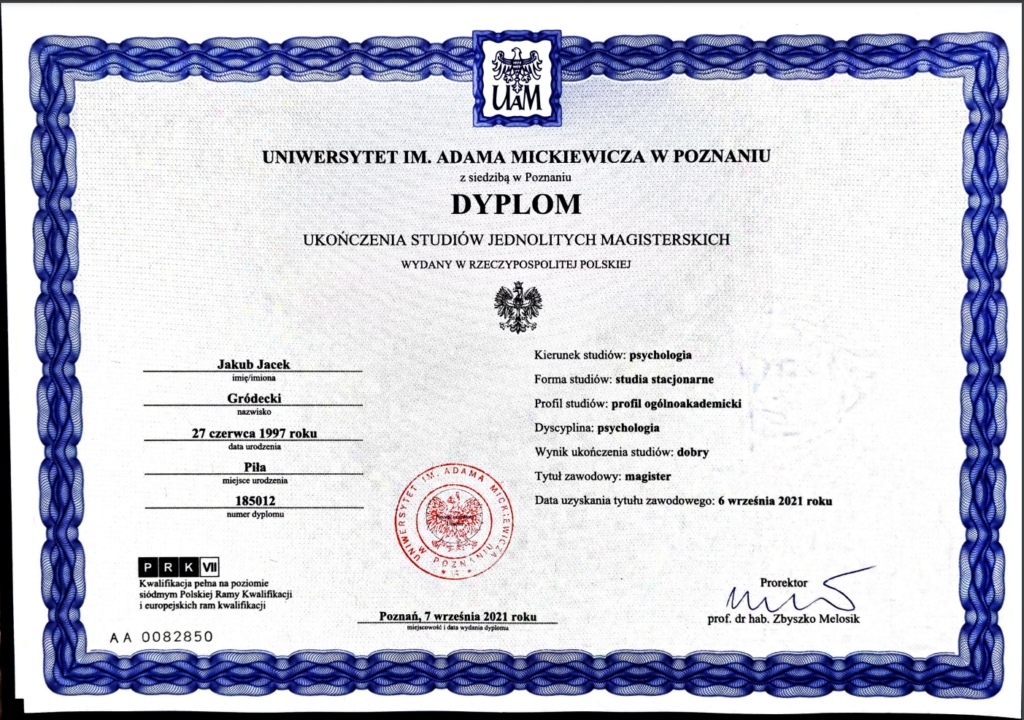 - Psychologia, studia magisterskie, Uniwersytet im. Adama Mickiewicza w Poznaniu
